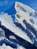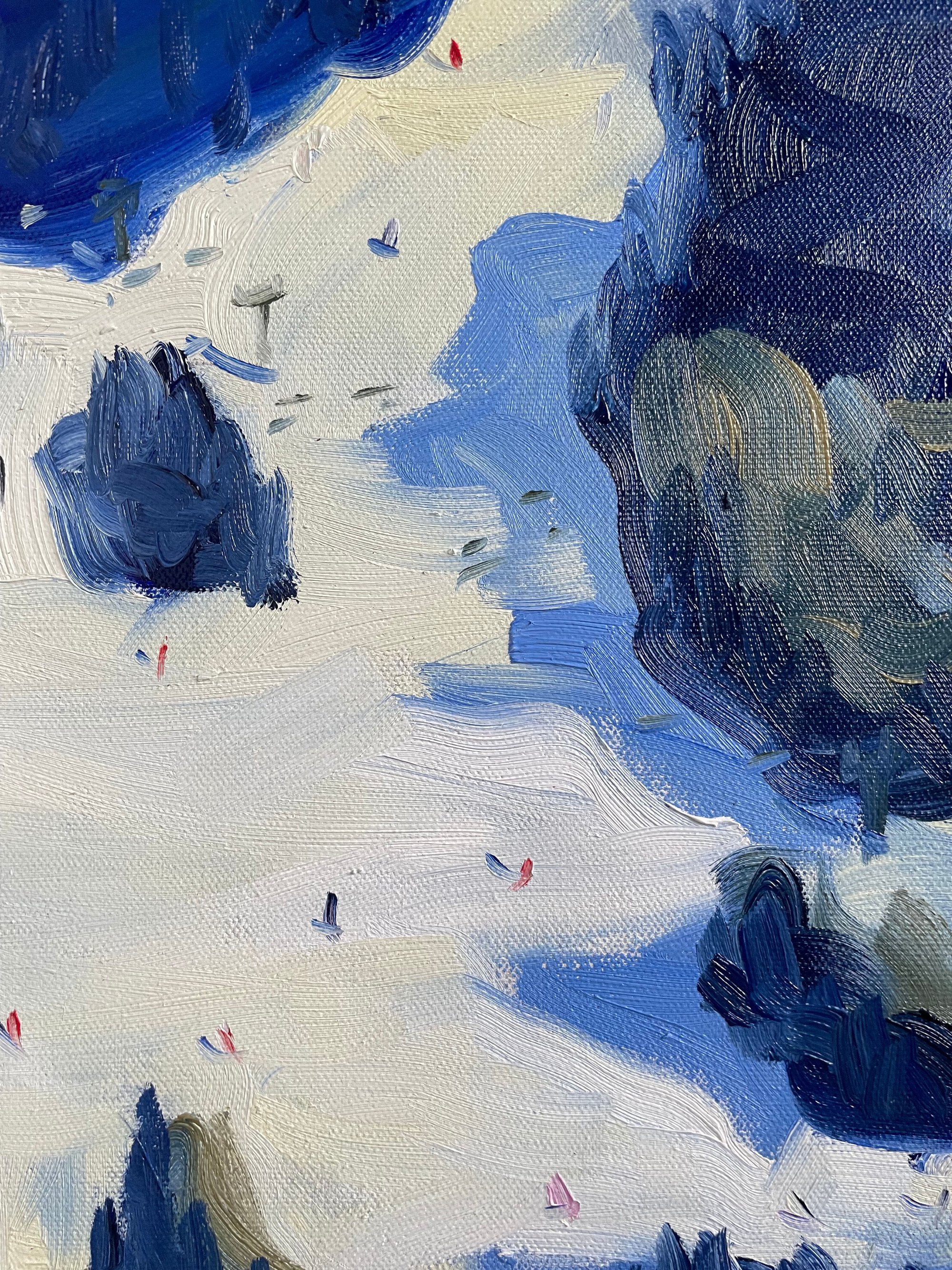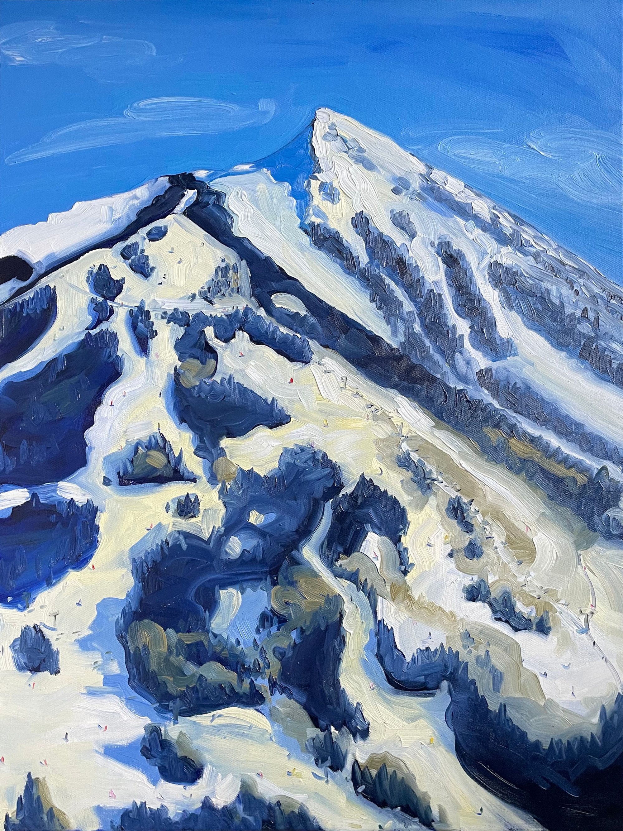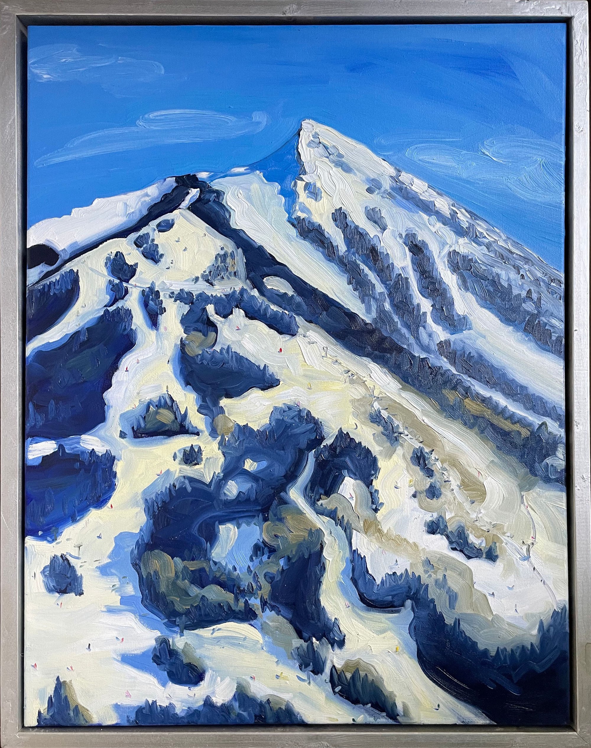 A birds eye view of Crested Butte Ski mountain that looks like dessert. Oil on canvas framed with a silver floater frame, 23 1/2 x 31 in. Thick and juicy brushwork on this one.