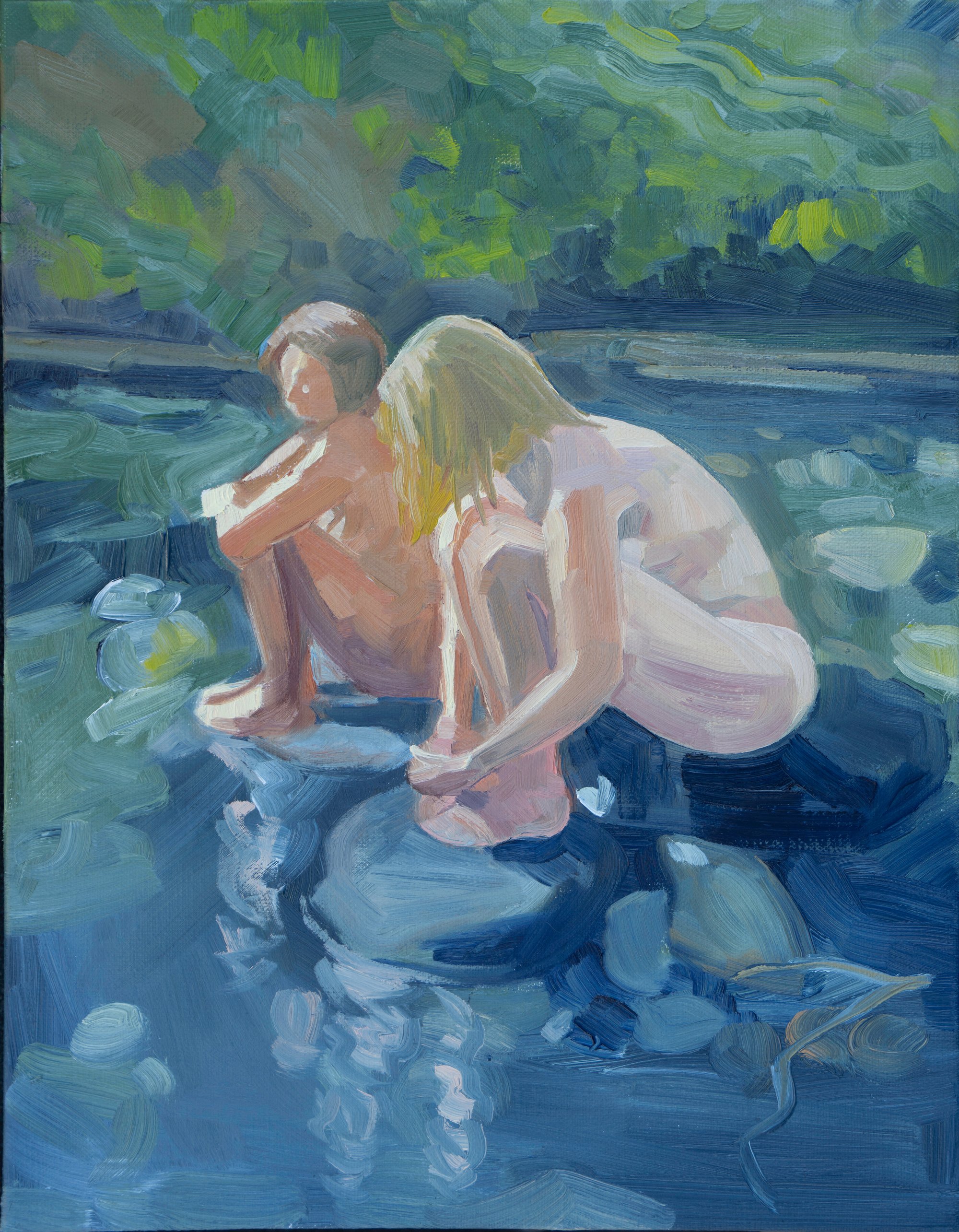 Sinny dipping and sun bathing, a soft figurative oil painting, 11x14 oil on linen with a simple black frame